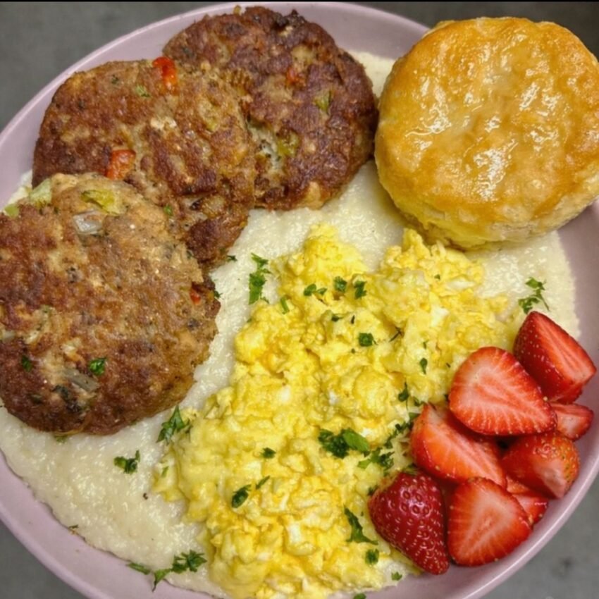 That sounds like an absolutely delicious breakfast! Here’s how you can create a beautiful breakfast plate with salmon patties, grits, scrambled eggs, a biscuit, and fresh strawberries: