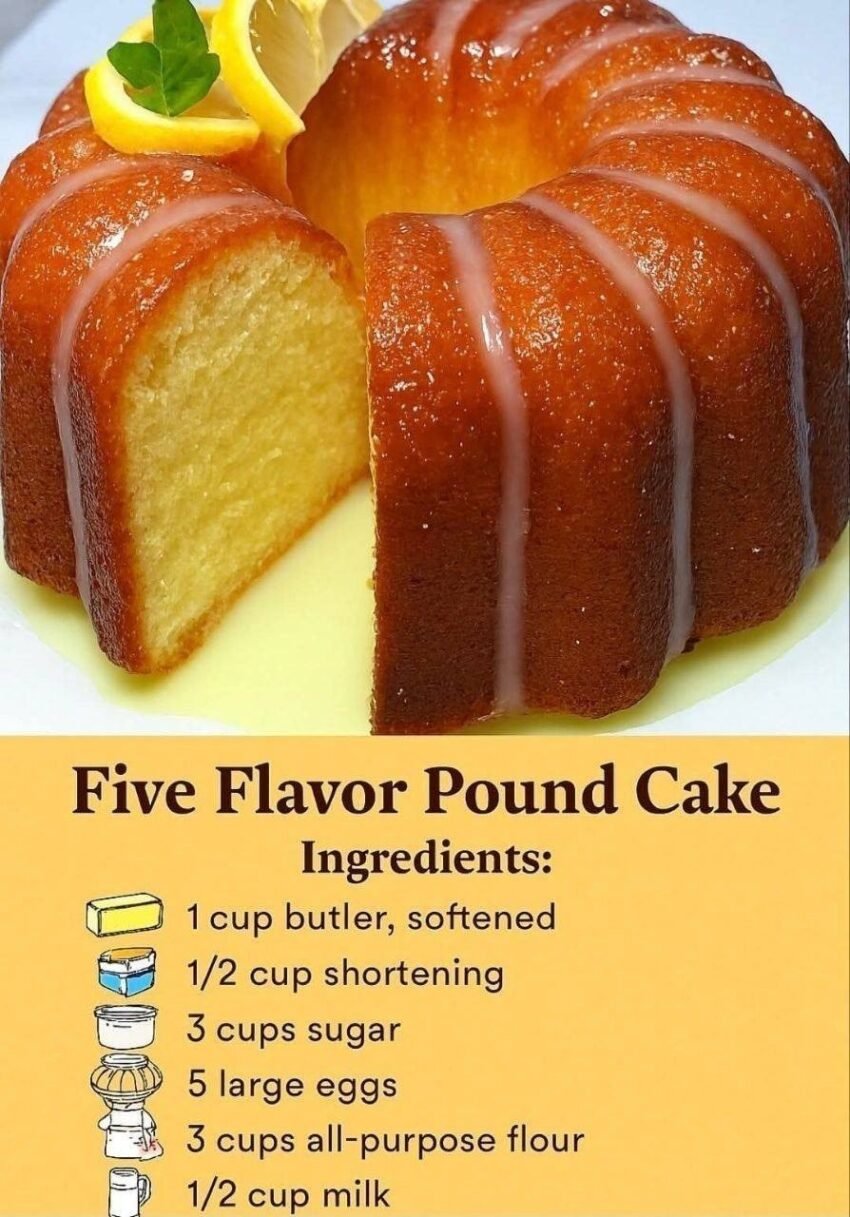 Here’s a classic Five-Flavor Pound Cake recipe that balances buttery richness with hints of vanilla, almond, orange, lemon, and rum. Perfect for a 9×5-inch loaf pan!