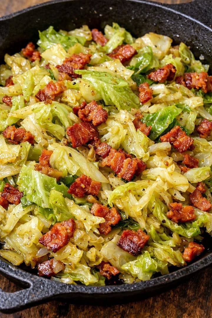 Here’s a simple and delicious recipe for Fried Cabbage with Bacon, Onion, and Garlic 🥓🥬