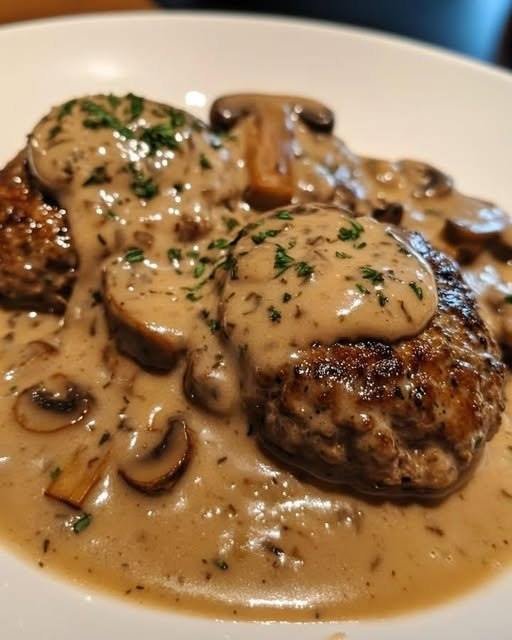 Here’s a comforting, classic Salisbury Steak with Mushroom Gravy—rich, savory, and perfect with mashed potatoes or rice: